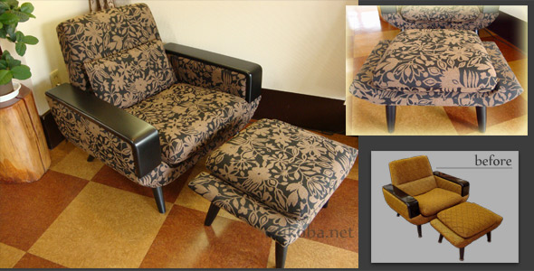 昭和40年代に製作された椅子。黒地に茶色の植物モチーフ柄で張替えました。 座面奥行があるので共布の腰当てクッションもセットです。 内部交換/木部塗装/座面置きクッション式