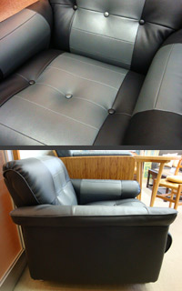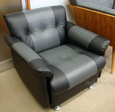 内部のバネを補強し、座のクッション材を交換して少し硬めの座り心地に張替えました。 ブラックとグレーのビニルレザーで張り分け、車のシートのような仕上がりに。