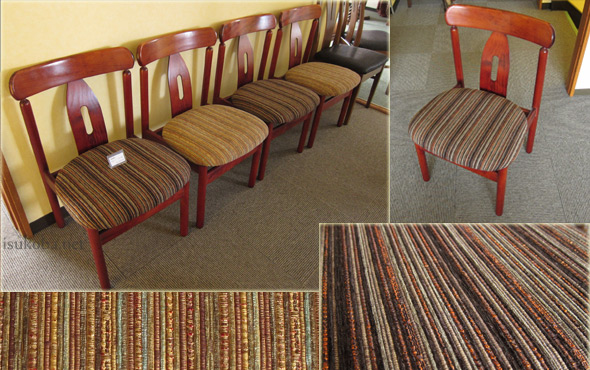 ナチュラルな織物調生地で張替えた食堂椅子4脚。 少し赤みの強い木部に合わせ、こげ茶系と赤系ストライプの色違いで2脚ずつ張替えました。