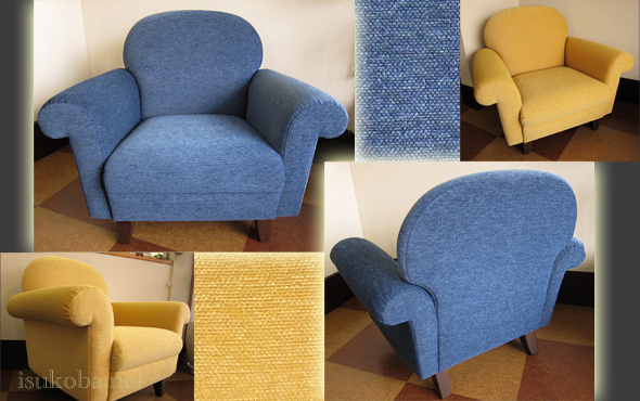 椅子工房の看板をそのままデザインしたオリジナルのアームチェア ゆったりとした肘と全体的なアーチが存在感を放ちます。イメージカラーのイエローと落ち着いたブルーの生地で仕上げました。 お好みの生地で張ることのできる受注製作も承ります。