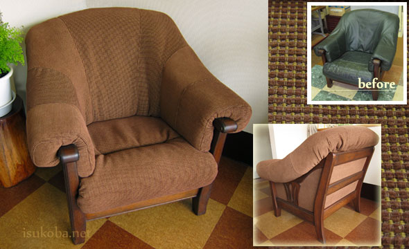 背と肘が一体クッションで包みこまれるような座り心地。 柔らかな手触りと色合いの生地で張替え、ぬくもりが感じられる椅子に仕上がりました。