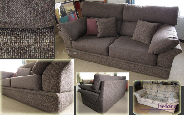 背と肘が羽毛クッションのボリュームあるアメリカ製ソファ 本体には荒い織目の生地を使い、クッション部分はネップ素材とどちらも天然繊維を含んだナチュラルな風合いの生地で張り分けました。 本体座面は補強して、しっかりとした座り心地に仕上げています。