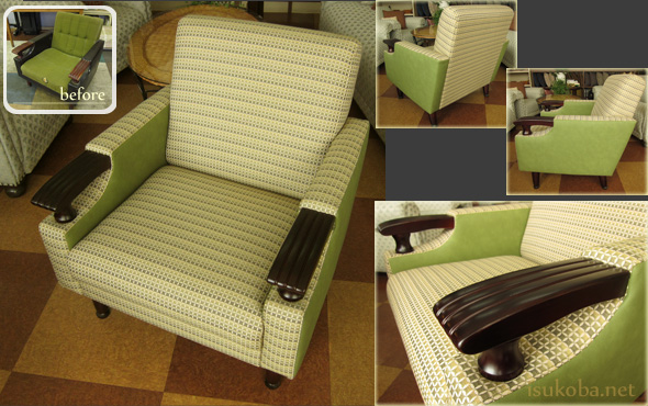 コンパクトサイズにかっちりとしたデザイン、昭和の香り漂う安楽椅子。 グリーングラデーションのブロック柄生地と、肘側面にはアンティーク調レザーを使いレトロモダンな仕上がりに。