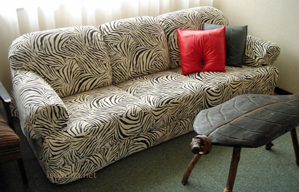 20年以上使用していた革張りのソファをインパクトのあるアニマル柄の生地で張替えました。 低めの座は少し硬めに仕上げ、安定感のある座り心地に。